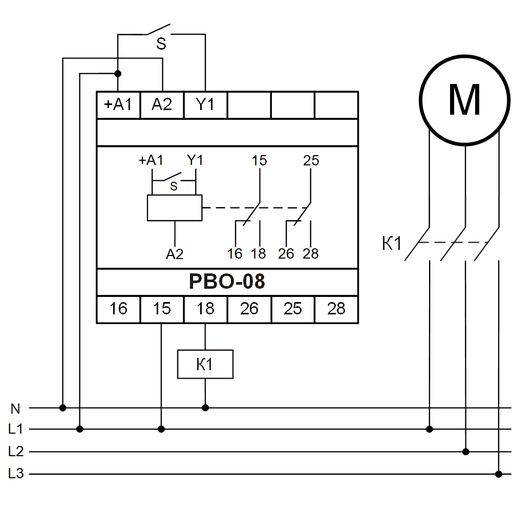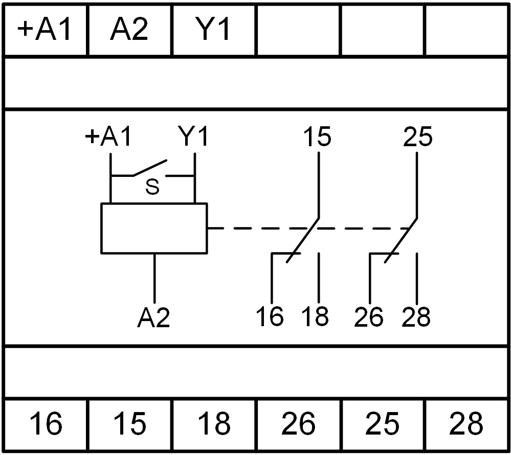В обесточенном состоянии замкнуты контакты 15-16 и 25-26. После подачи напряжения питания загорается зелёный индикатор «U» реле начинает отрабатывать выбранную диаграмму, во время отсчёта заданной выдержки времени зелёный индикатор «U» мигает. При включении реле загорается жёлтый индикатор «» при этом контакты 15-16 и 25-26 размыкаются, а контакты 15-18 и 25-28 замыкаются.