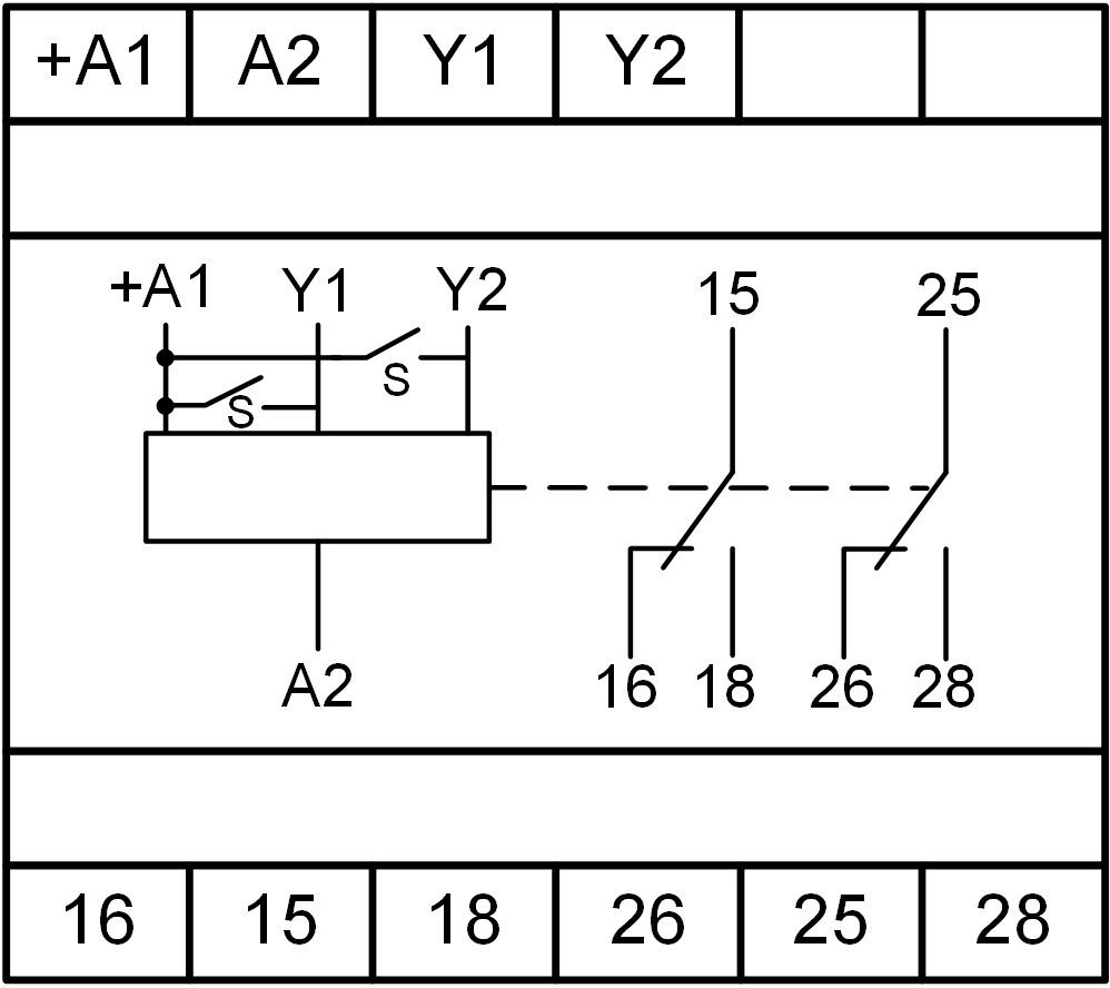 Команда внешнего управления подаётся на клемму «Y1» и формируется замыканием сухого контакта «S» между клеммой «Y1» и клеммой «+А1». Команда на сброс счётчика (диаграммы 5 и 6) подаётся на клемму «Y2» и формируется замыканием сухого контакта S между клеммой «Y2» и клеммой «+А1».  В обесточенном состоянии замкнуты контакты 15-16 и 25-26. После подачи напряжения питания загорается зелёный индикатор «U» реле начинает отрабатывать выбранную диаграмму, во время отсчёта заданной выдержки времени или счета импульсов зелёный индикатор «U» мигает. При включении реле загорается жёлтый индикатор «» при этом контакты 15-16 и 25-26 размыкаются, а контакты 15-18 и 25-28 замыкаются.