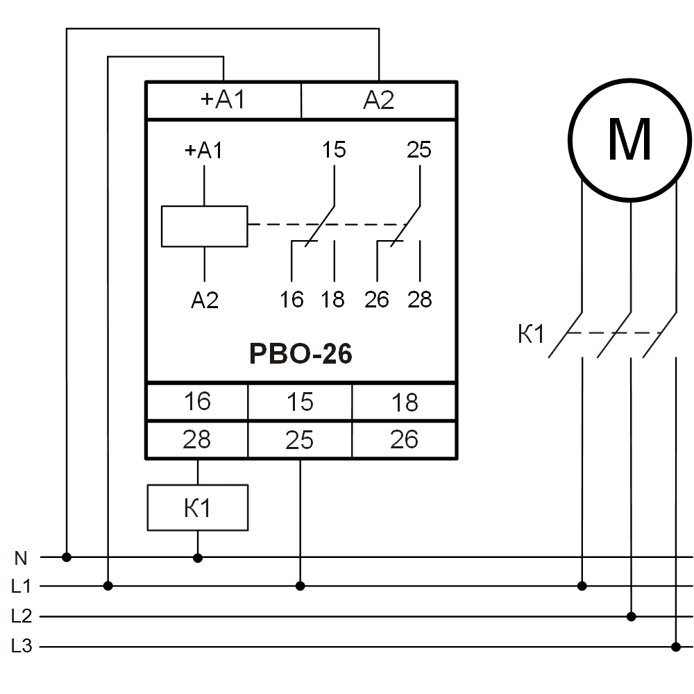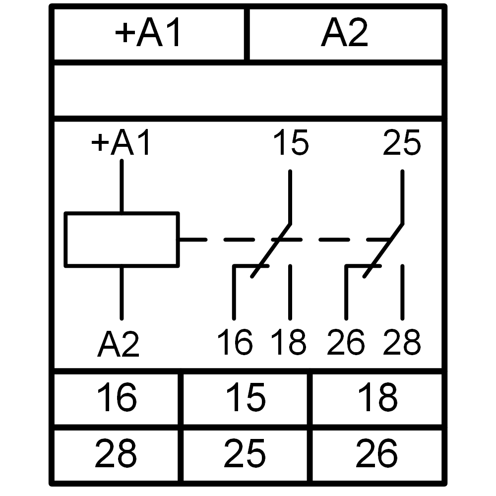 Диаграмма работы МК - при подаче питания включается индикатор «U», включается исполнительное реле, замыкаются контакты 15-18 и 25-28. При снятии напряжения питания выключается индикатор «U», исполнительное реле выключается и замыкаются контакты 15-16 и 25-26. Напряжение питания подаётся на клеммы «+А1» и «А2».