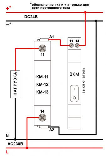 КМ-13 — позволяет настроить задержку включения при подаче управляющего питания. При подаче напряжения питания на управляющие выводы А1 и А2, начинается отсчет времени включения (настраивается пользователем), силовой контакт при этом остается разомкнутым. По завершении отсчета силовой контакт замыкается, включается желтый индикатор. После снятия напряжения с управляющих выводов силовой контакт размыкается, желтый индикатор выключается. Использование функции задержки включения контактора, позволяет разнести во времени пуск реактивных нагрузок с целью снижения мгновенных значений пускового тока.
