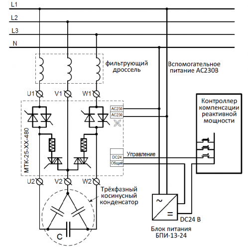 Бесконтактные тиристорные контакторы серий МТК-2Х предназначены для коммутации компенсирующих конденсаторов в установках компенсации реактивной мощности (УКРМ). Этот способ регулирования реактивной мощности применяется для электросетей, где характер нагрузки изменяется очень быстро, например, со сварочными аппаратами, штамповочными прессами, лифтами, кранами, управляемым электроприводом и т.д.