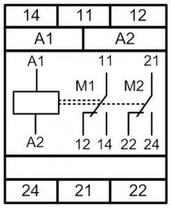 При подаче питания на клеммы А1-А2 замыкаются контакты 11-14, загорается индикатор «М1», включается агрегат 1. При снятии питания замыкаются контакты 11-12, гаснет индикатор «М1», отключается агрегат 1. При следующей подаче питания на клеммы А1-А2 замыкаются контакты 21-24, загорается индикатор «М2», включается агрегат 2. При снятии питания замыкаются контакты 21-22, гаснет индикатор «М2», отключается агрегат 2.