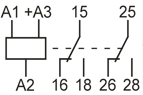 (паузы). Во время «импульса» замкнуты контакты реле 15 -18 и 25 -28 и включен индикатор «реле», а во время «паузы» - замкнуты контакты реле 15 -16 и 25 -26 и выключен индикатор «реле». Напряжение питания АСDC24 В подается на клеммы «+А3» и «А2», а напряжение питания АС220 В - на клеммы «А1» и «А2». Схема подключения реле приведена на рис.3 и на шильдике, расположенном на корпусе реле.
