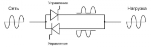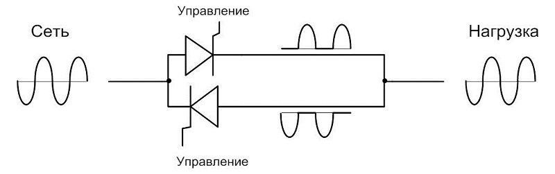 Модуль тиристоров состоит из двух тиристоров, включённых встречно-параллельно. Каждый тиристор пропускает ток только в одном направлении, то есть только положительные или отрицательные полупериоды тока.