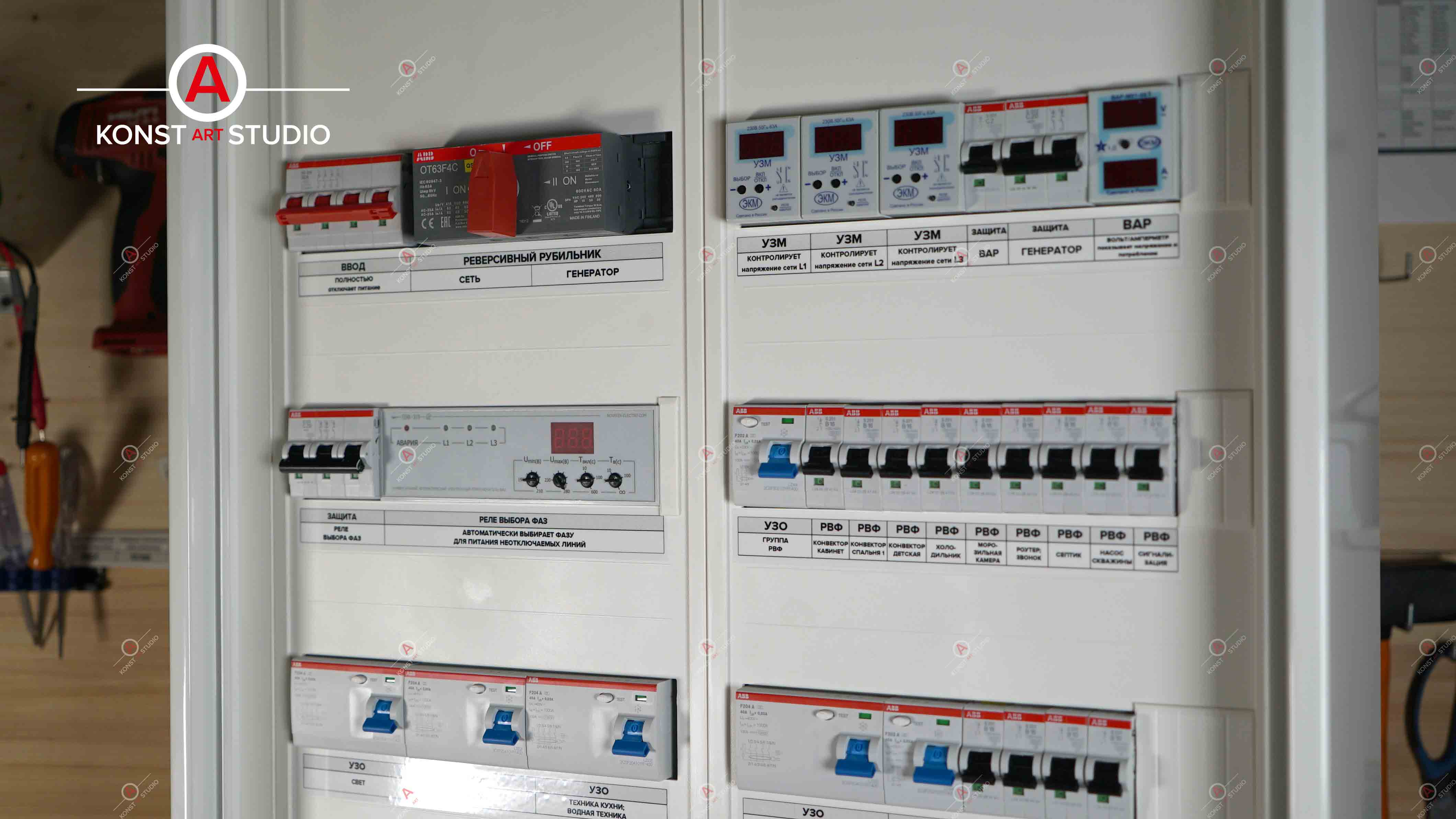 Устройство представляют собой реле контроля напряжения с мощным встроенным реле на выходе, дополненное варисторной защитой. Устанавливается на монтажную рейку-DIN шириной 35мм (ГОСТ Р МЭК 60715-2003) с передним подключением проводов питания коммутируемых электрических цепей. Клеммы туннельной конструкции обеспечивают надёжный зажим проводов суммарным сечением до 25мм². На лицевой панели расположены: кнопки управления «+» и «-», двухцветный зелёный/красный светодиод (далее-СД) «норма/авария», жёлтый светодиод (далее-СД) «реле», трёхразрядный семисегментный индикатор для отображения информации.
